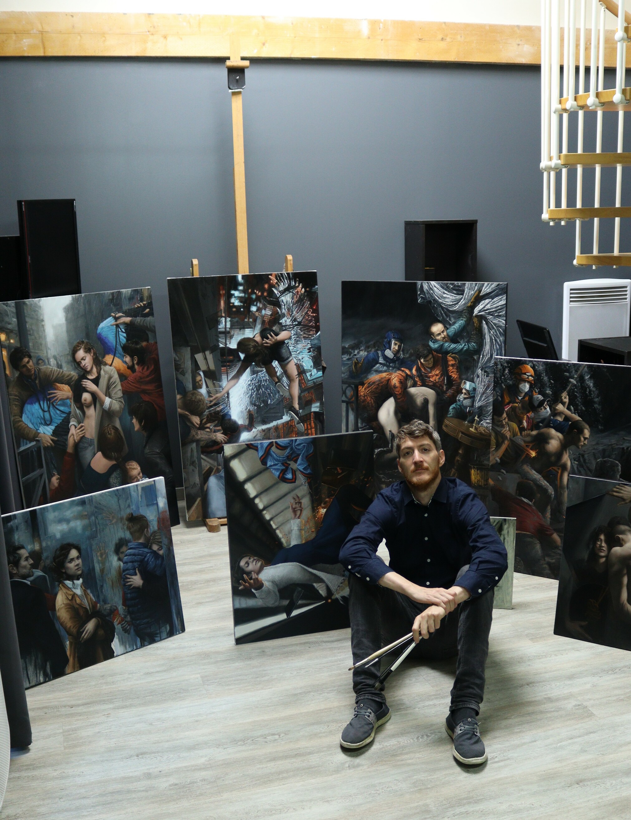 Mon parcours n’a pas été linéaire, loin de là ! Mon travail actuel est l’aboutissement d’expériences multiples, c’est une rencontre formelle entre l’art et la philosophie, notamment avec le mouvement existentialiste qui a beaucoup influencé mon travail. Principalement autodidacte, je suis arrivé aux beaux-arts sur le tard, après avoir beaucoup hésité durant mes études entre l’art et la philosophie. Ne rentrant dans aucun moule, c’est cette deuxième option que j’ai choisie : J’ai mis l’art de côté pour faire des études de philosophie. La lecture de penseurs comme Kierkegaard, Nietzsche, Heidegger, Jonas ou encore Lévinas a profondément marqué ma pensée. Cette influence existentialiste se retrouve aujourd’hui dans mes peintures, à travers les thèmes que j’aime explorer : l’absurde, l’angoisse, la mort, le bien et le mal, la responsabilité, l'altérité, la présence, le visage. Durant toutes ces années d’étude, la philosophie, aussi clairement articulée soit-elle, m’a toujours semblé manquer de quelque chose. Une forme de puissance lui échappait sans cesse : cette puissance poétique et créatrice que je retrouvais dans le Caravage. Tout était trop verbal, il manquait de la matière. Il manquait aux penseurs cette puissance évocatrice des maîtres italiens, capables de parler avec des formes. C’est alors que l’évidence du dessin et de la peinture s’est à nouveau imposée à moi : il fallait donner une forme aux idées. J’ai dû apprendre à peindre tout seul, sur le tard. En parallèle, j’ai commencé à partager mon travail sur internet, et notamment à travers des vidéos sur YouTube qui ont contribué à me faire connaître. C’est de là que tout est parti.